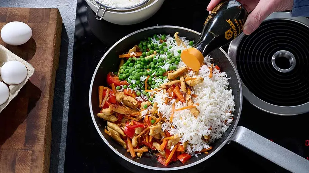 Nasi goreng – stekt ris i indonesisk stil – är snabbt, gott och fullt av smak. Med mör kyckling, knapriga grönsaker, ett stekt ägg på toppen och den söta, fylliga smaken av Kikkoman sås till ris är det ett bra sätt att använda upp överblivet ris.
