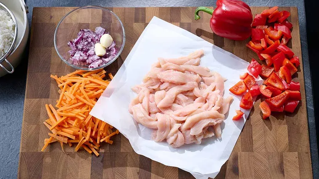 250 g jasminris – 400 g kycklingbröstfilé – 2 morötter – 2 röda paprikor – 1 rödlök – 2 vitlöksklyftor
