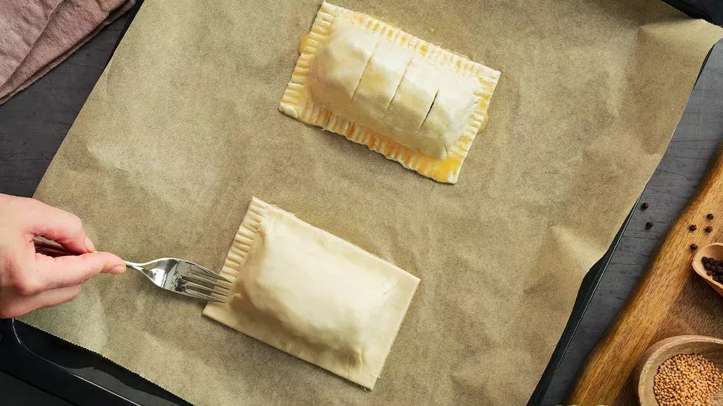 Täck ingredienserna med nästa lager pajdeg och använd en gaffel för att skapa ett mönster runt kanten.