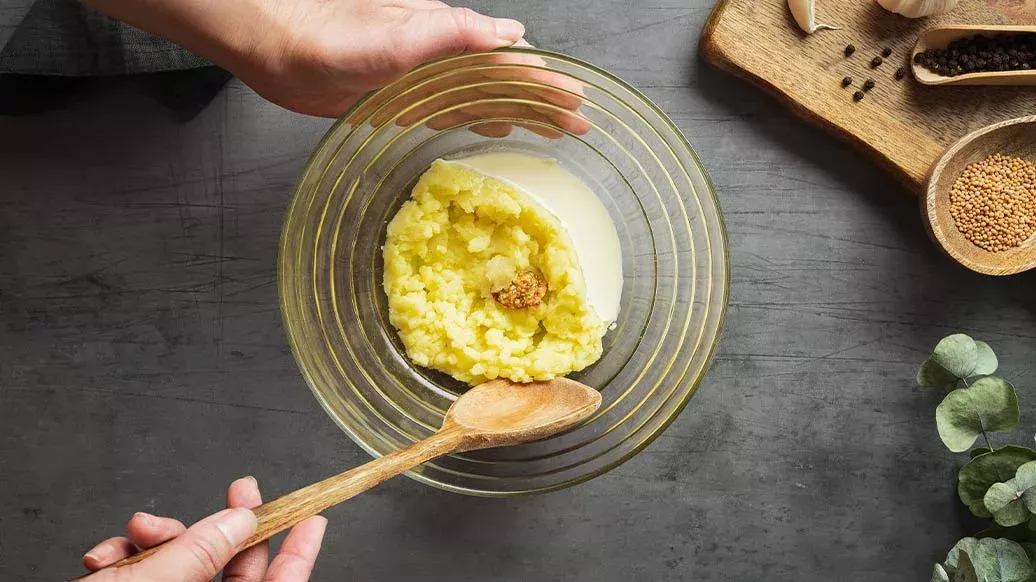 80 g potatis – 1 liten vitlöksklyfta – 1 msk färsk grädde – 1 tsk senap – 1 nypa salt