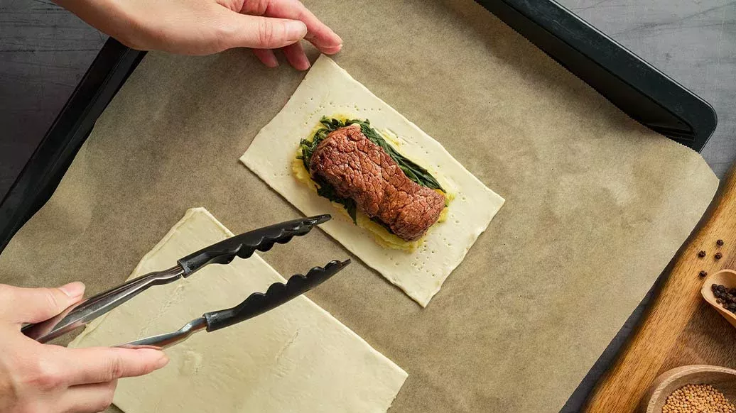 Lägg köttet från steg 1 ovanpå potatisen och linda den kokta spenaten runt köttet.