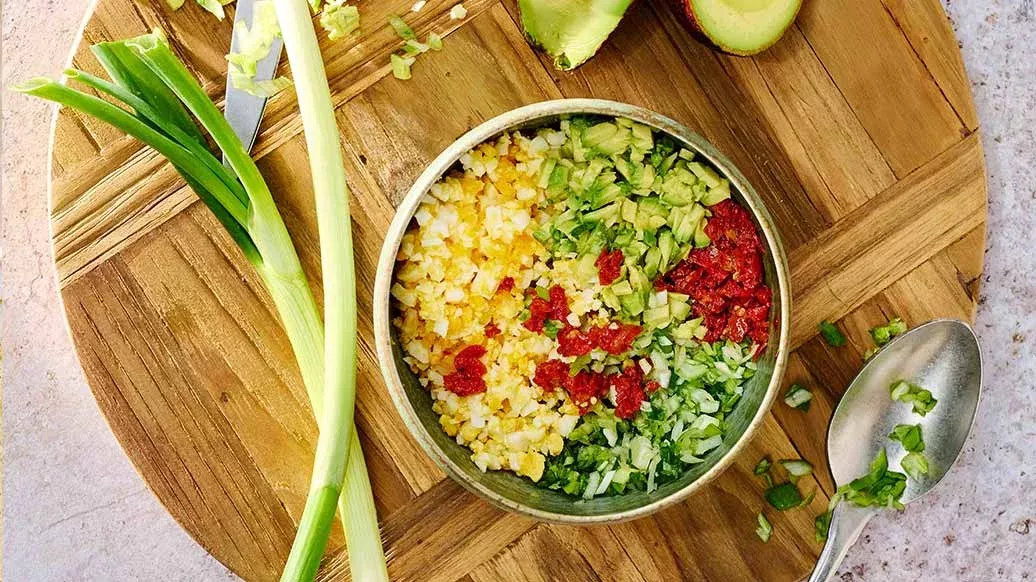 Skala och finhacka äggen, finhacka även avokado, salladslök och tomater och blanda ihop dem.