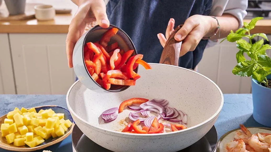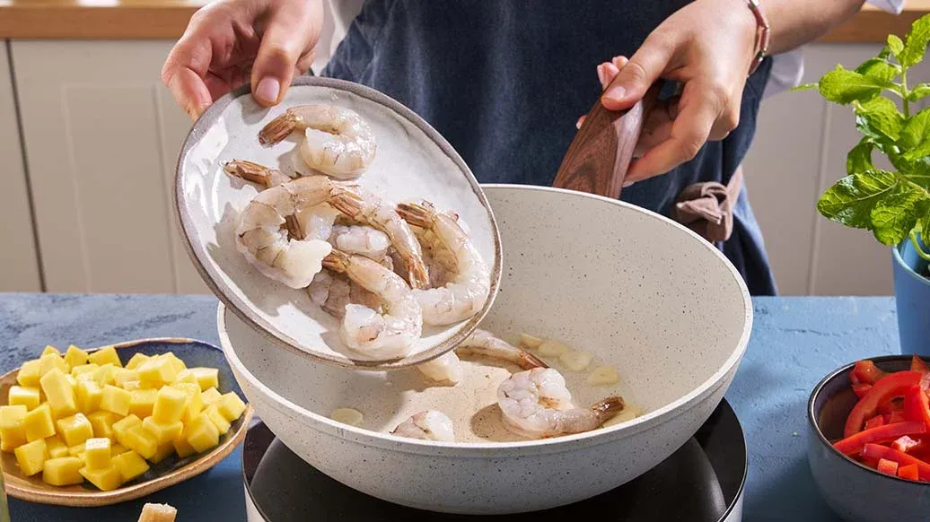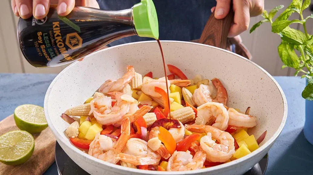 En livfull wokrätt med räkor, mango och lime, förstärkt av den djupa umamin i Kikkoman sojasås med mindre salt– en perfekt balans mellan fräschör och fyllighet i varje tugga.