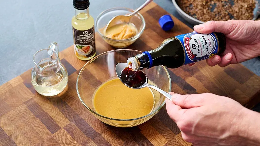 1 tsk misopasta – 2 msk äppelcidervinäger – 2 tsk linfröolja – 2 tsk Kikkoman naturligt bryggd Tamari glutenfri sojasås – 1 tsk Kikkoman söt Matlagningssås i Mirin-Stil – Nymalen peppar – 2 tsk linfrö (valfritt om krossade) – 2 msk vatten
