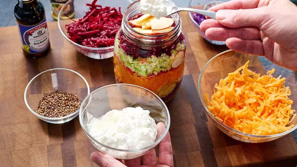 Lägg upp salladen i en hög glasburk enligt följande: dressing, rödkål, äpple, morot, rädisa, spetskål, rödbeta, päron, färskost och linfrö. Stäng burken och skaka kort innan servering för att fördela dressingen. Alternativt servera salladen i skålar.