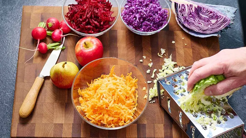 Riv spetskålen, rödkålen, rödbetorna och morötterna grovt var för sig. Skiva rädisorna och skär äpplet och päronet först i klyftor och sedan i skivor.