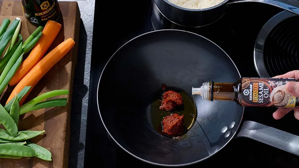 Skär kycklingen i bitar. Skär paprikan i strimlor, salladslöken i ringar, morötterna i skivor och halvera dina sugar snaps. Fräs currypastan i het Kikkoman Sesamolja i en wok. Tillsätt kokosmjölken, ca. 100 ml vatten och Kikkoman sojasås och koka upp.