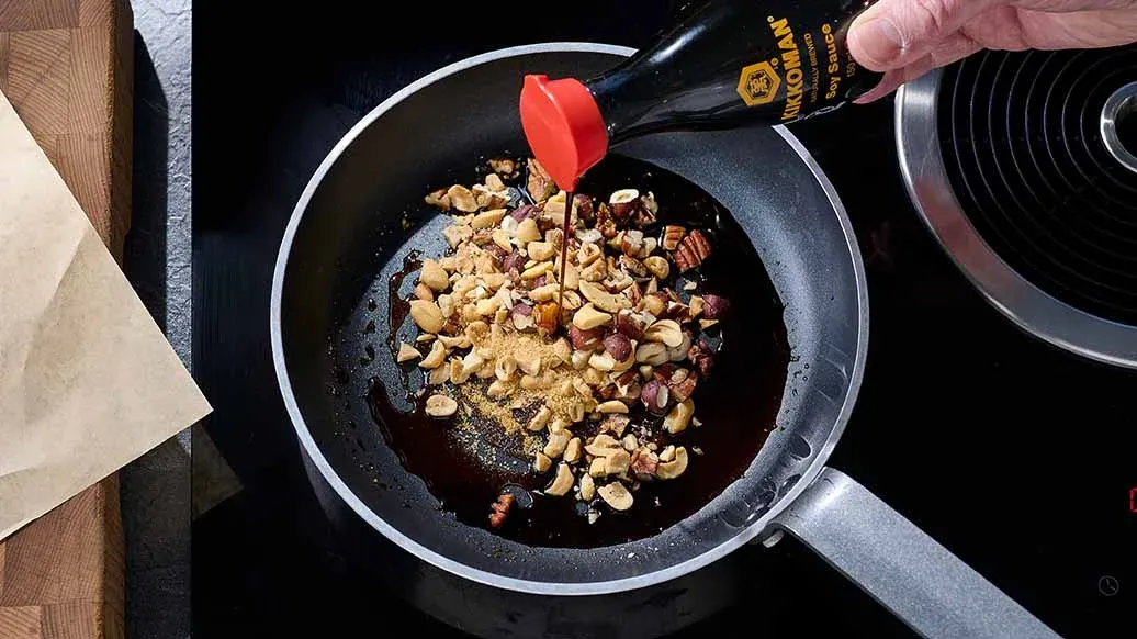 Hacka nötterna grovt. Värm Kikkoman sojasås med sockret, tillsätt nötterna och glasera. Lägg över på bakplåtspapper och låt svalna.