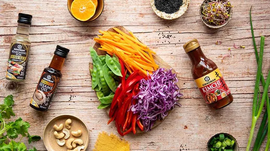 Djärv i smaken och full av färg, denna rödkålssallad med grönsaker är toppad med cashewnötter, svarta sesamfrön och färsk koriander, allt i en krämig dressing med Kikkoman Kimchi Chilisås och sesamolja.