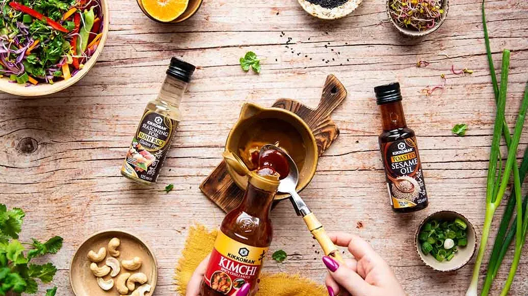 Blanda ingredienserna till dressingen i en separat skål: Kikkoman Kimchi chilisås, mandarinjuice, jordnötssmör, Kikkoman sesamolja, lönnsirap, Kikkoman smaksättning för sushiris och vatten. Häll dressingen över salladen och blanda väl. Rosta cashewnötterna i en torr panna, låt dem svalna och hacka sedan. Strö cashewnötterna och de svarta sesamfröna över salladen, servera!