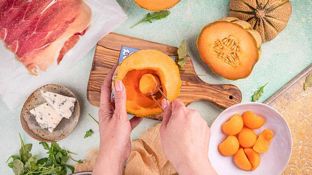 Dela melonen på mitten och gröp ur kärnorna. Använd en melonskopa för att göra bollar av fruktköttet eller skär den i tärningar. Häll över melonen i en skål.