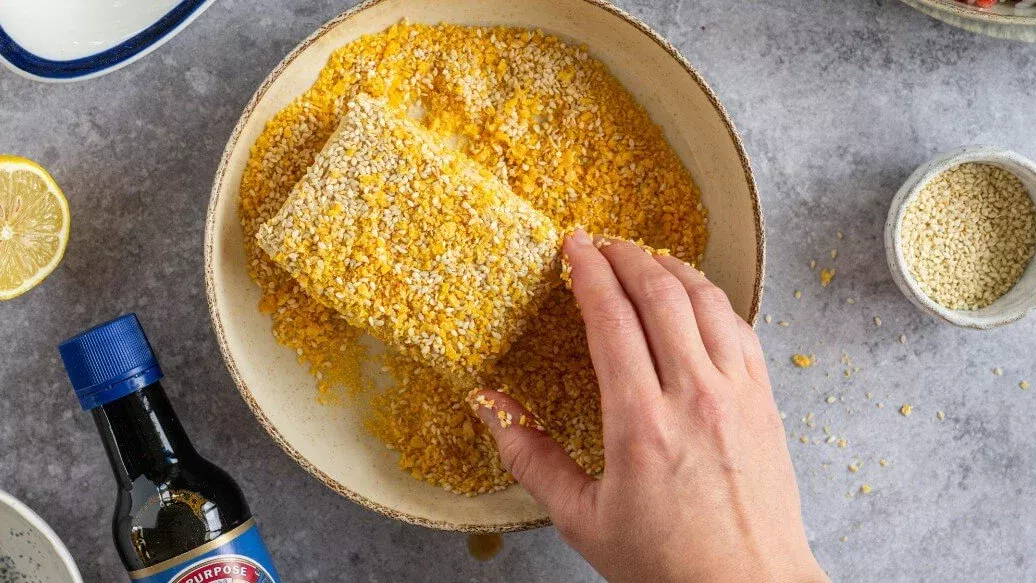 Blötlägg tofun i en blandning av Kikkoman glutenfri sojasås, mandelmjölk och potatismjöl, strö sedan över sesamfrön och malda cornflakes. Stek i olivolja tills de är gyllenbruna.