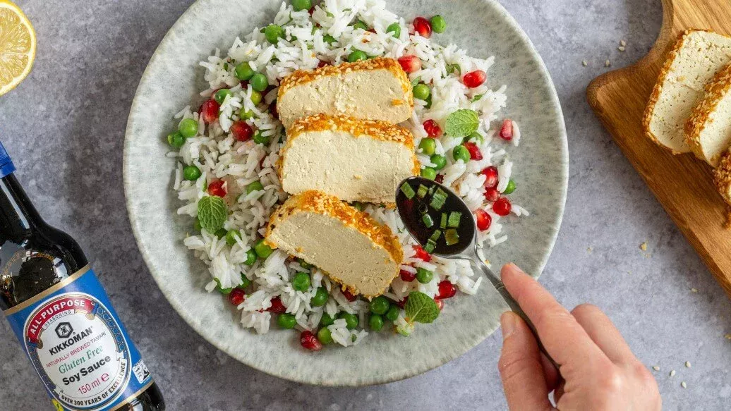 Skiva den stekta tofun och servera med ris och tillagade tillbehör. Ringla över en sås gjord på en blandning av Kikkoman glutenfri sojasås, lönnsirap elelr sirap, sesamolja och gräslök.