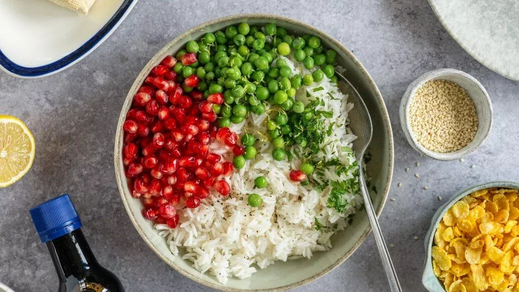 Skölj riset, tillsätt dubbel mängd vatten och koka i 10 minuter. Koka ärtorna mjuka och blanda ihop dem med riset, hackad mynta, citronskal, citronsaft, peppar och granatäppelkärnor.