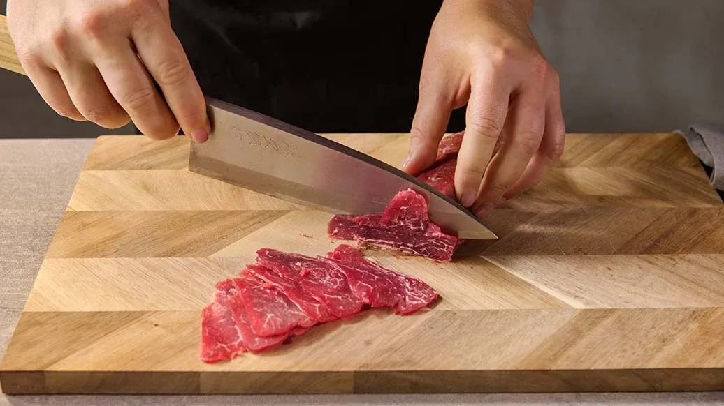 Ställ nötköttet i frysen i ca 40-50 minuter – det är lättare att skära i tunna skivor när det svalnat.