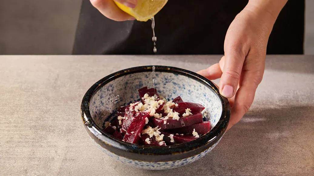 Skär rödbetan i stavar som pommes frites och blanda den med Kikkoman sesamolja, hackad ingefära och citronsaft.