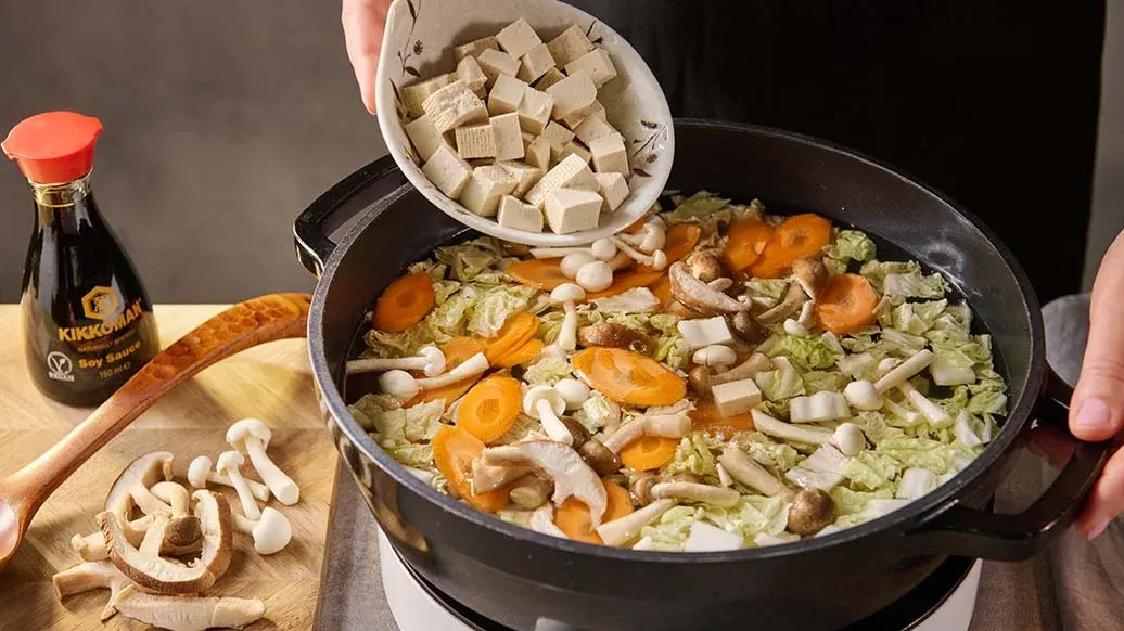 Förbered dashibuljongen enligt instruktionerna på förpackningen. Skär morötter och vitkål i mindre bitar. Rensa svampen. Tillsätt grönsakerna i buljongen och koka i cirka 10 minuter. Tillsätt slutligen den tärnade tofun och Kikkoman sojasås.
