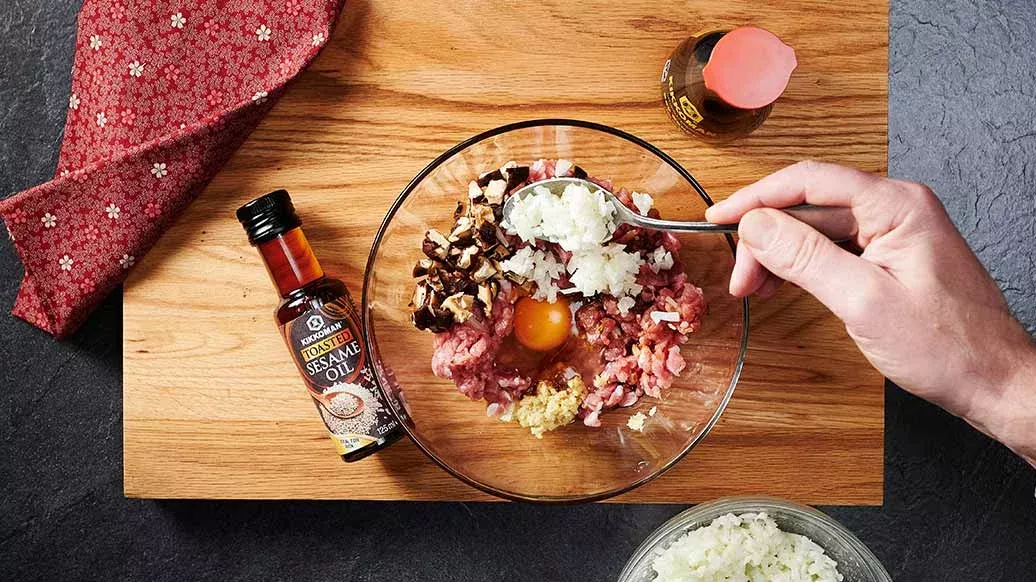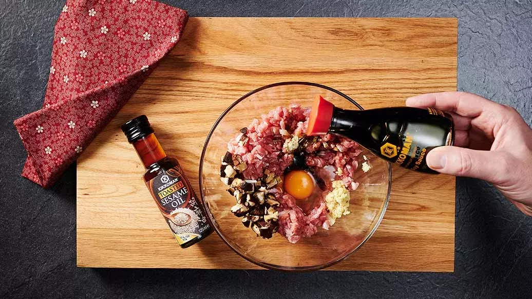 Lägg det ”sammantryckta köttet i en stor skål. Tillsätt shiitakesvamparna, ingefäran, sockret, köttbuljongen, sojasåsen, ägget, sesamoljan och saké och blanda allt väl för hand.