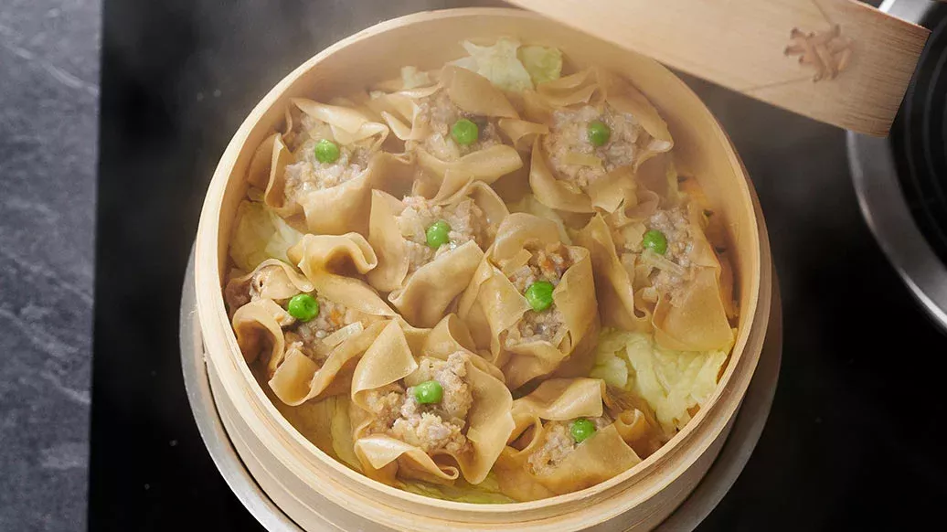 Fördela degplattorna på en arbetsyta och lägg ca 30 g köttfyllning på varje degplatta. Forma degen med fyllningen till en skålformig blomma. Tryck till botten så att den blir plan och shumaiknytena kan bli stående.