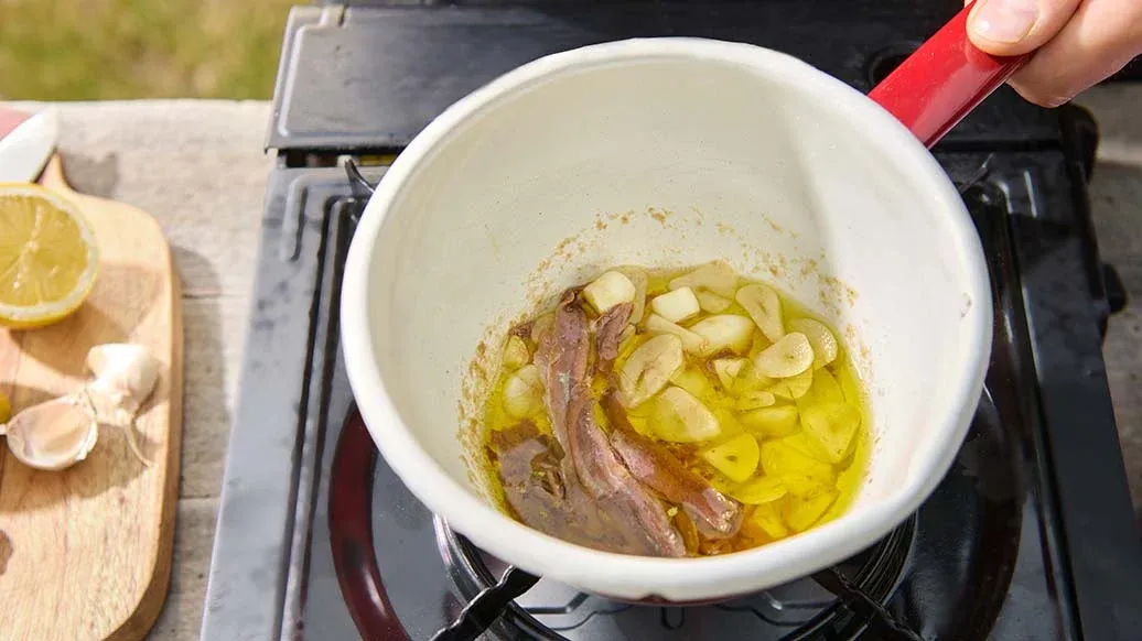 Hetta upp olivoljan i en liten kastrull på låg-medelvärme. Tillsätt hackad vitlök och hackade ansjovisfiléer. Koka, rör om ofta, i 7–8 minuter tills vitlöken doftar och ansjovisen har lösts upp i oljan. Ta av från värmen, puréa med en stavmixer eller mal i en mortel och ställ åt sidan.