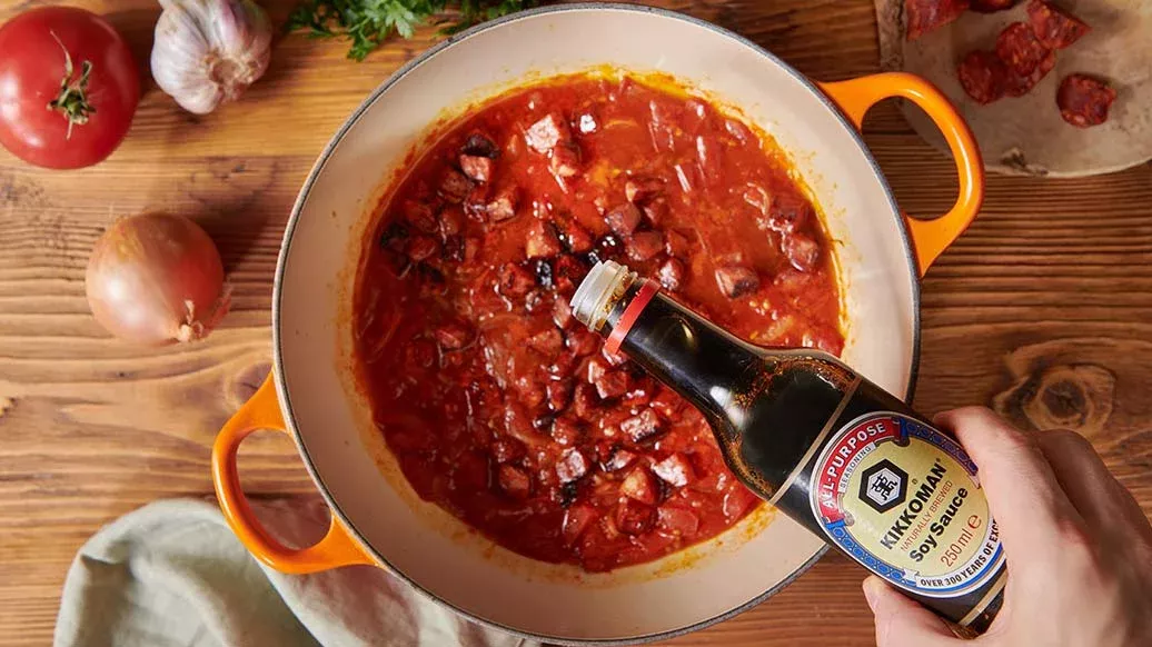 Ställ en stor panna på medelhög värme, tillsätt olivolja och stek chorizon i 2 minuter. Sänk värmen, tillsätt den hackade löken och låt den mjukna i 5 minuter. Tillsätt sedan vitlök, rökt paprikapulver, Kikkoman sojasås och fortsätt koka i 2 minuter till. Var noga med att inte bränna vitlöken. Tillsätt sedan hackade tomater, öka värmen till hög och reducera all vätska med ½.