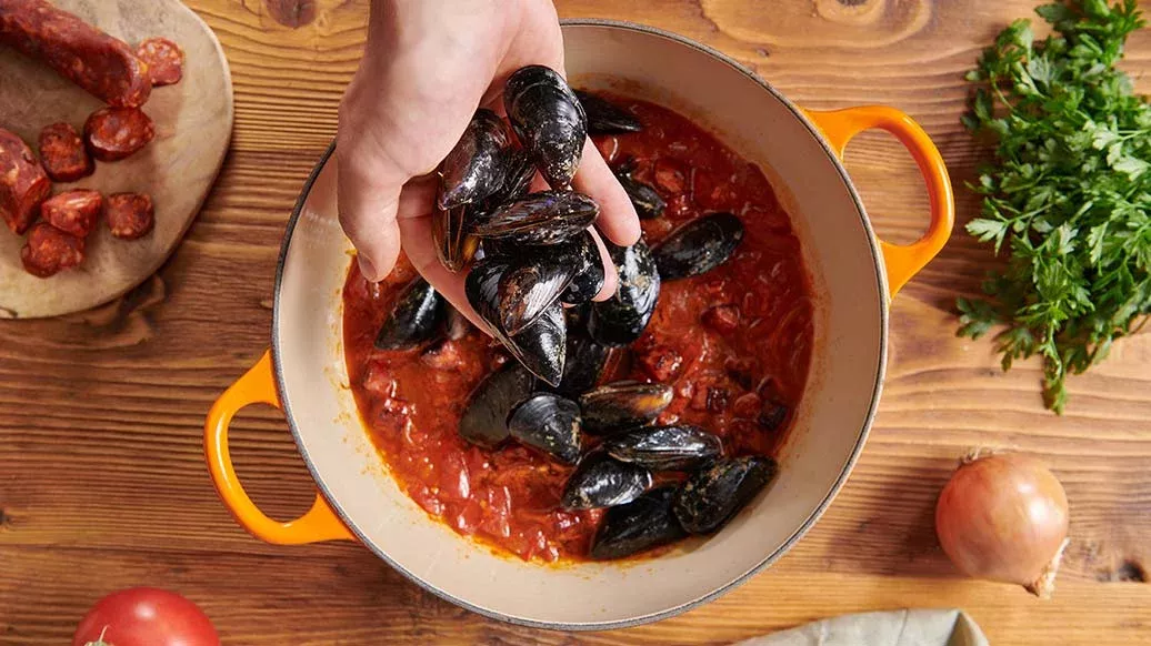 Musslor och chorizo stuvade i tomatsås med rökt paprikapulver, vitlök och persilja. Smakerna intensifieras av umamirik Kikkoman Sojasås.