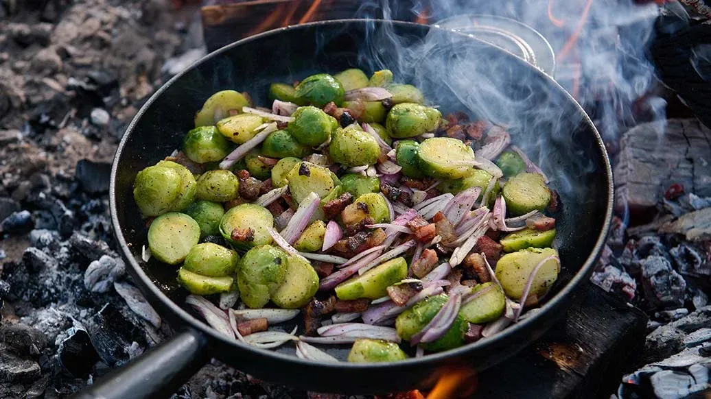 70 g italiensk guanciale, tärnad – 300 g brysselkål, putsad och halverad – 2 schalottenlökar