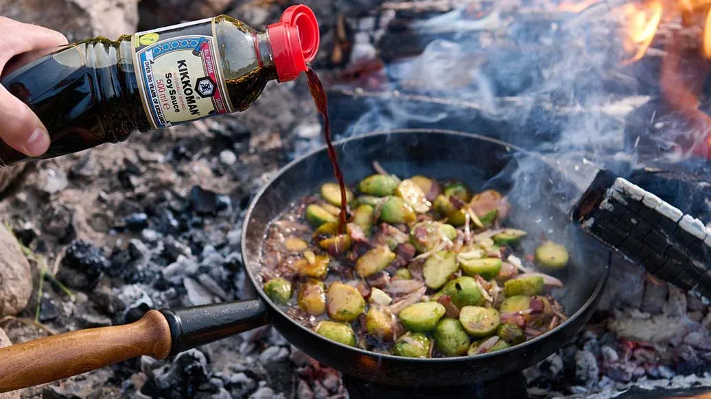 Tillsätt Kikkoman sojasås, Kikkoman Teriyaki BBQ-sås Honung och vitlökstärningar till guanciale, schalottenlök och brysselkål i pannan. Fortsätt koka i 1-2 minuter tills det bildas en fin, silkeslen sås som täcker alla brysselkål. Överför till ett serveringsfat. Garnera med den skivade inlagda citronen, syrliga äppeltärningar, färska basilikablad och riven pecorinoost.
