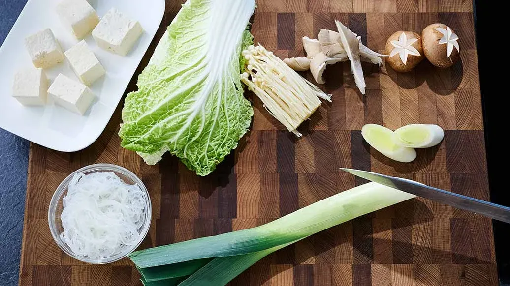 Skär tofun i lagom stora bitar. Skär ett kryss på toppen av shiitakesvamparna. Hacka ostron och enokisvampen grovt. Skär kinakålen i 5 cm bitar. Skiva den vita delen av purjolöken tunt på diagonalen. Förbered vermicelli enligt anvisningarna på förpackningen.