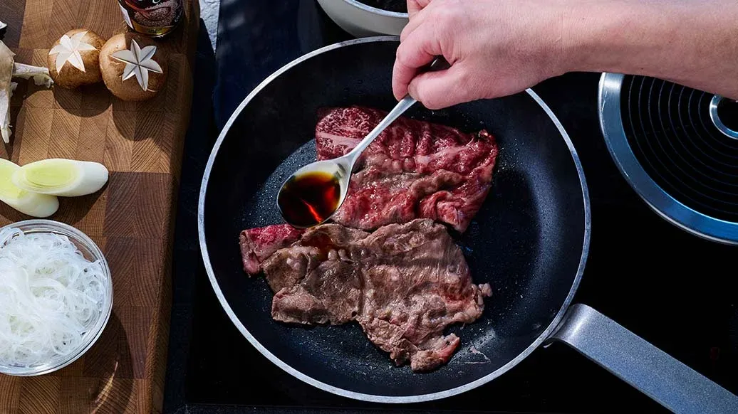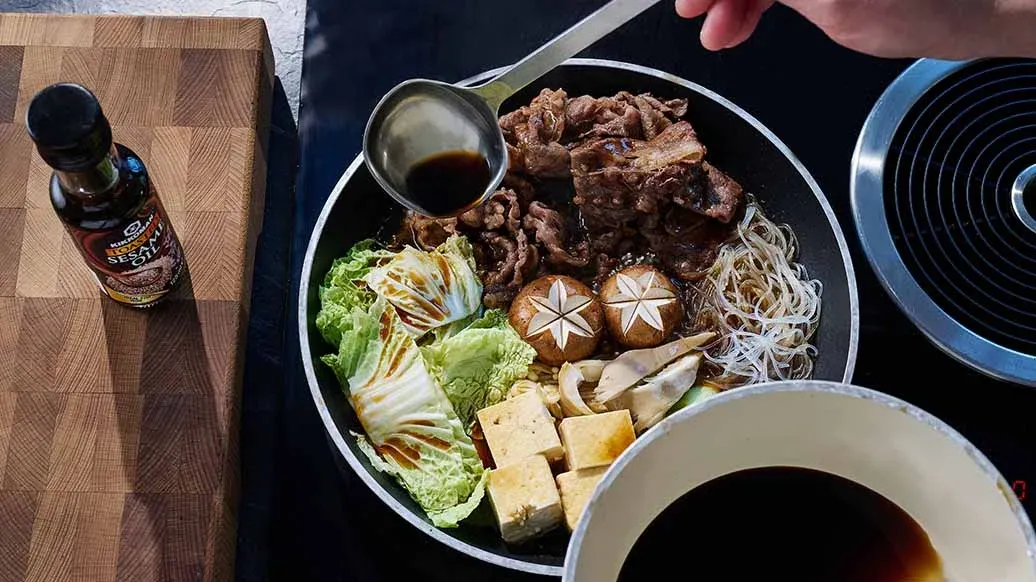 En traditionell japansk gryta med tunt skivat nötkött, tofu och grönsaker som puttras i en söt och välsmakande buljong, förstärkt med den rika umamien från Kikkoman sojasås.