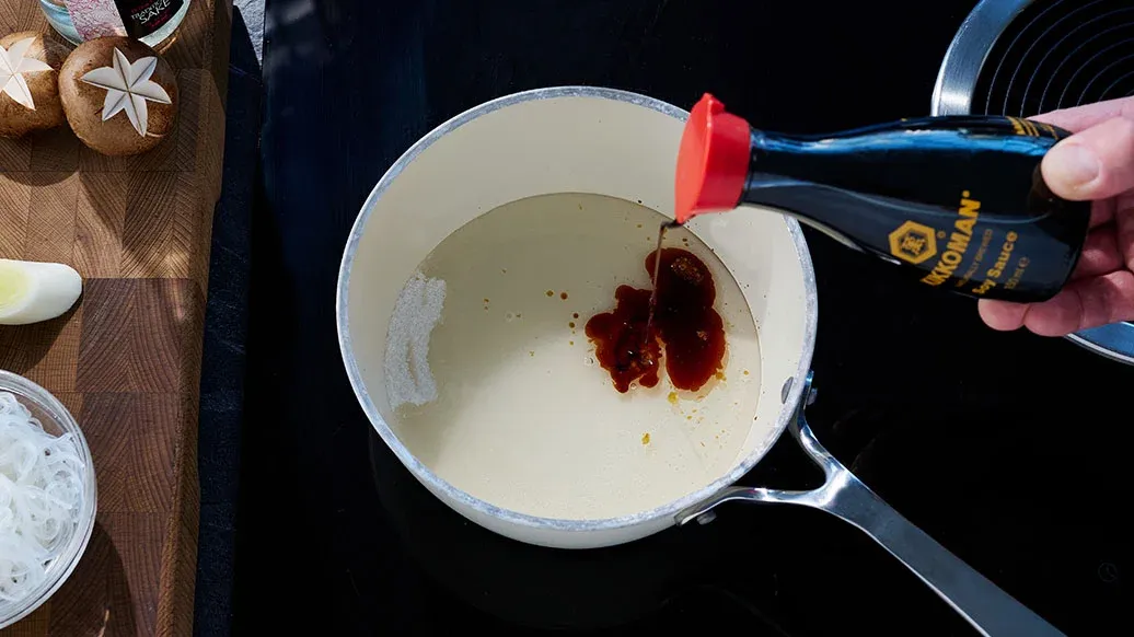 För att göra sukiyakibuljongen, värm Kikkoman sojasås, Kikkoman söt matlagningskrydda i Mirin-stil, sake och socker i en kastrull tills sockret har löst sig.