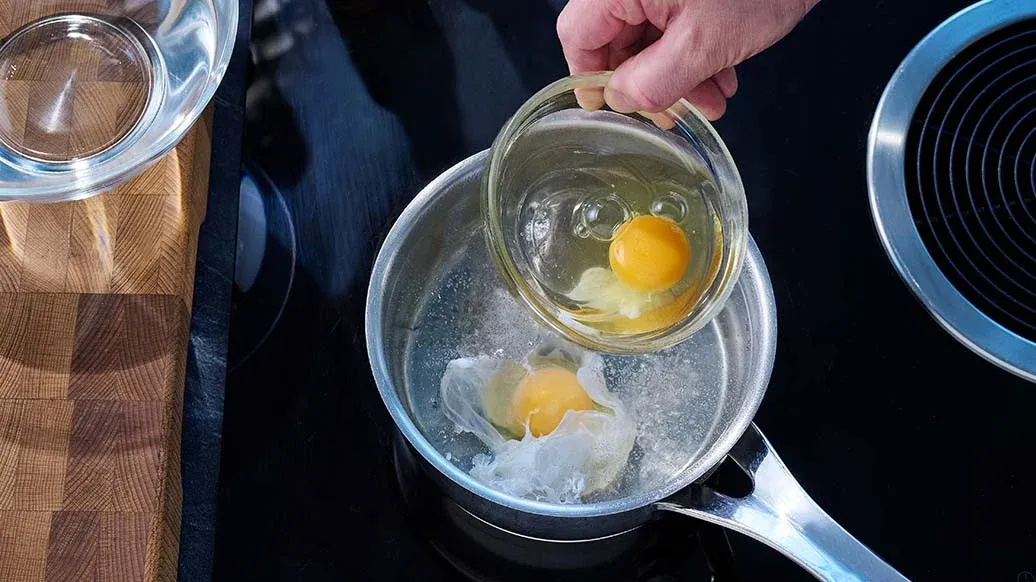 Värm ca. 1 liter vatten till 90°C och tillsätt vinägern. Knäck äggen i bägare och skjut försiktigt ner dem i vattnet ett i taget. Sjud försiktigt i ca 3 minuter. Ta bort med en hålslev och låt rinna av på hushållspapper för att få pocherade ägg.
