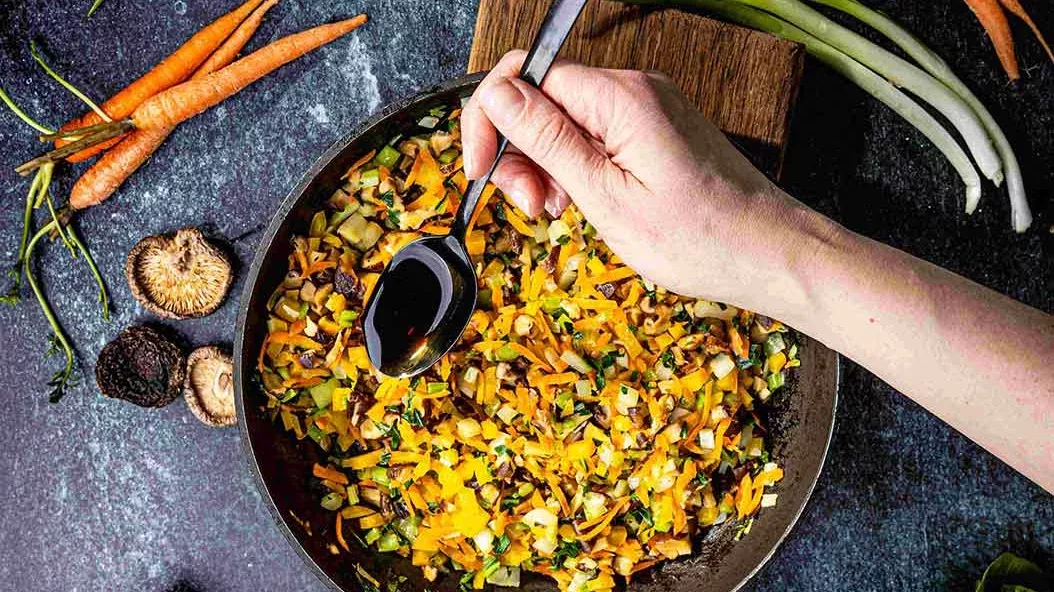 Blötlägg svampen i varmt vatten och låt stå i 15 minuter. Hacka pak choi-kålen. Strimla moroten med ett stort rivjärn och finhacka paprikan och vitlöken. Fräs grönsakerna i Kikkoman Sesamolja, tillsätt sedan den hackade svampen och Kikkoman sojasås. Stek i några minuter under konstant omrörning tills grönsakerna är mjuka. Ställ åt sidan för att svalna.