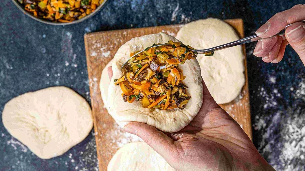 Dela degen från steg 1 i 6 lika stora delar och forma var och en till en boll. Kavla ut till en platt skiva. Placera fyllningen från steg 2 på varje skiva och försegla kanterna för att bilda en påse.