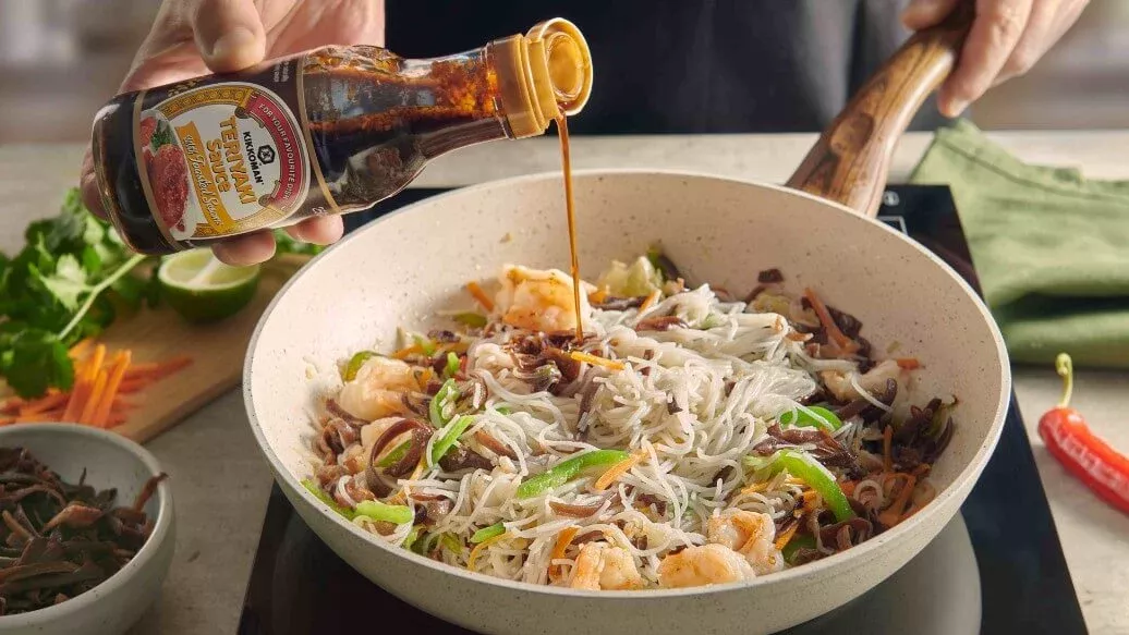 Stek i 1 minut. Tillsätt de kokta nudlarna och chilin. Stek i 2-3 minuter, tillsätt sedan Kikkoman Teriyakisås med sesam, limejuice och vatten. Blanda väl. Strö över koriander och sesamfrön och garnera med hackad salladslök på den färdiga rätten.