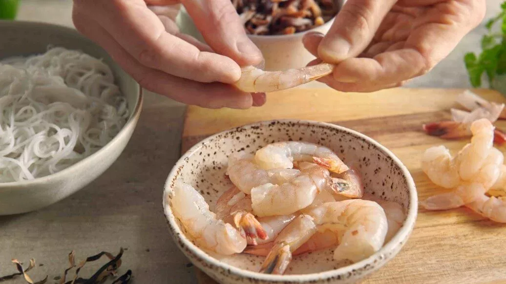 Rengör räkorna genom att ta bort skalen. Häll kokande vatten över den torkade svampen och blötlägg i 10 minuter.