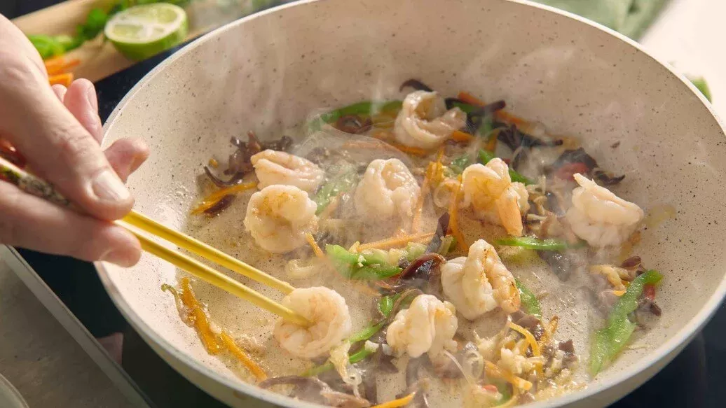 Skär grön paprika i strimlor och moroten i tändstickor. Finhacka schalottenlök, ingefära, chili och vitlök. Häll olja i en panna och stek i ca 1 minut. Tillsätt schalottenlök, ingefära, vitlök, grön paprika, morot, Mun-mushroom och räkor.