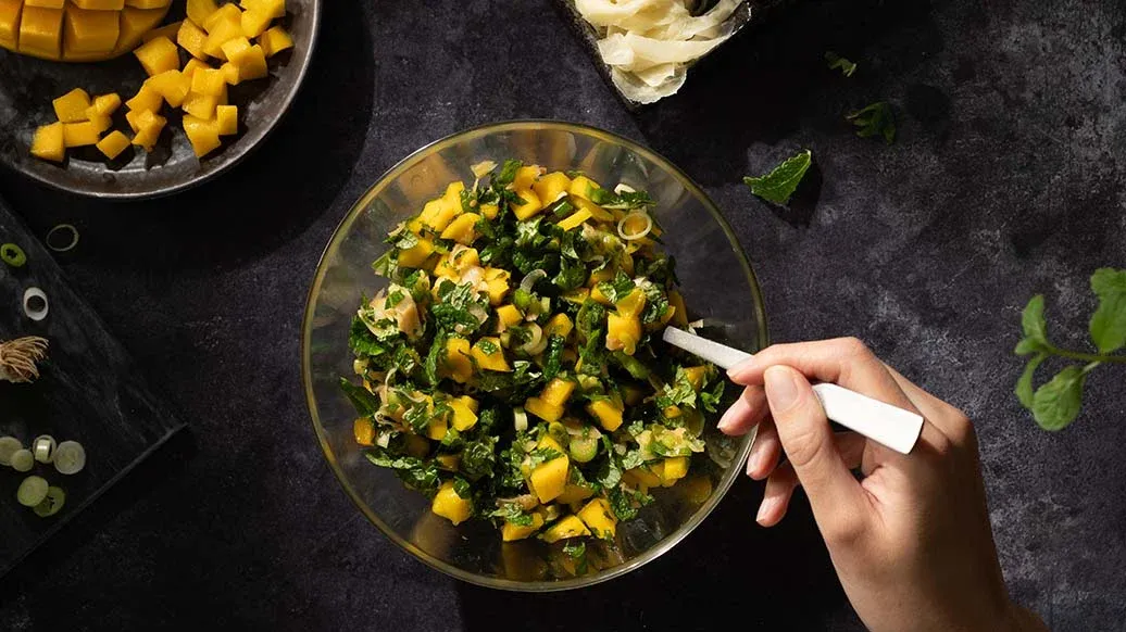 Börja med att förbereda salsan: skiva ingefäran i mindre bitar och blanda sedan med mango, mynta, salladslök, Kikkoman sesamolja och Kikkoman teriyakisås med vitlök. Låt marinera.