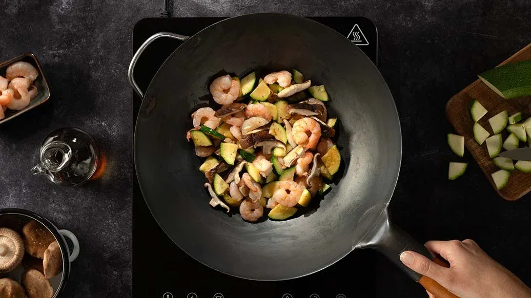 Värm vegetabilisk olja i en stor wokpanna och stek zucchini och svamp på hög värme i 2 minuter. Tillsätt jätteräkorna och woka i ytterligare 3 minuter. Deglasera med Kikkoman Teriyakisås med vitlök och rör om under en kort stund.
