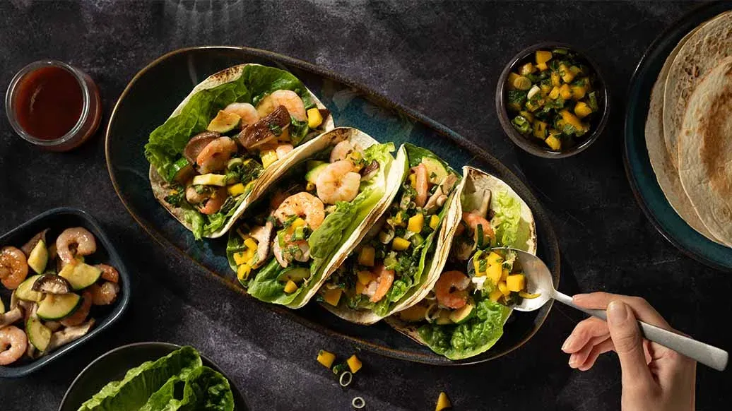Klä tacoskalen med salladsbladen och fyll med Kikkoman Kimchi Chilisås, mangosalsa, räkor och grönsaker.