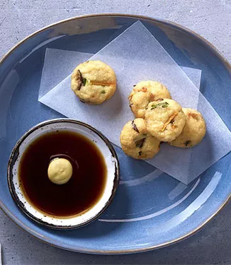 Mosa tofun fint till en jämn massa. Tillsätt och vänd ned väl saltet, strösockret, ägget och potatismjölet. Forma små bullar, tryck dem platta och stek i 170 °C. Vänd flera gånger och stek dem guldbruna på båda sidorna. Låt rinna av på kökspapper. Servera varma med Kikkoman Less salt sojasås med 43 % lägre salthalt och lagom stark senap.