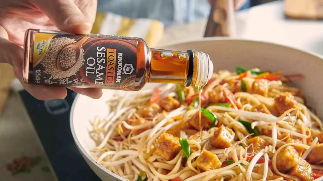 Hetta upp oljan i en panna, fräs schalottenlök och vitlök, tillsätt sedan morot och paprika. Stek i 2-3 minuter. Tillsätt tofun, mungbönor och kokta nudlar. Blanda med såsen från steg 3 och smaka av med chiliflakes och Kikkoman Sesamolja. Lägg den färdiga rätten på tallrikar och garnera med den hackade salladslöken.