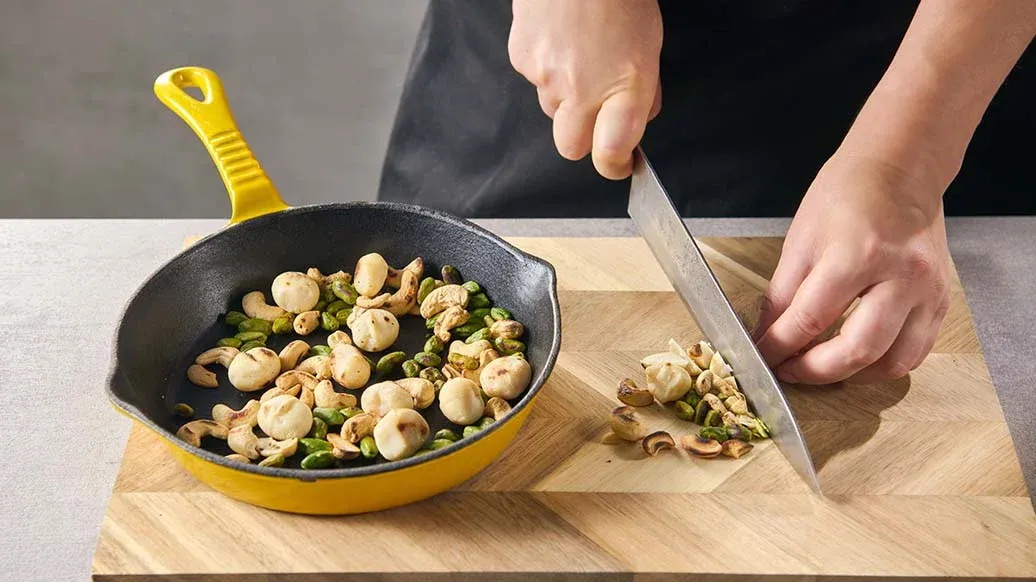Rosta nötterna i en panna i 5 minuter och krossa dem sedan.