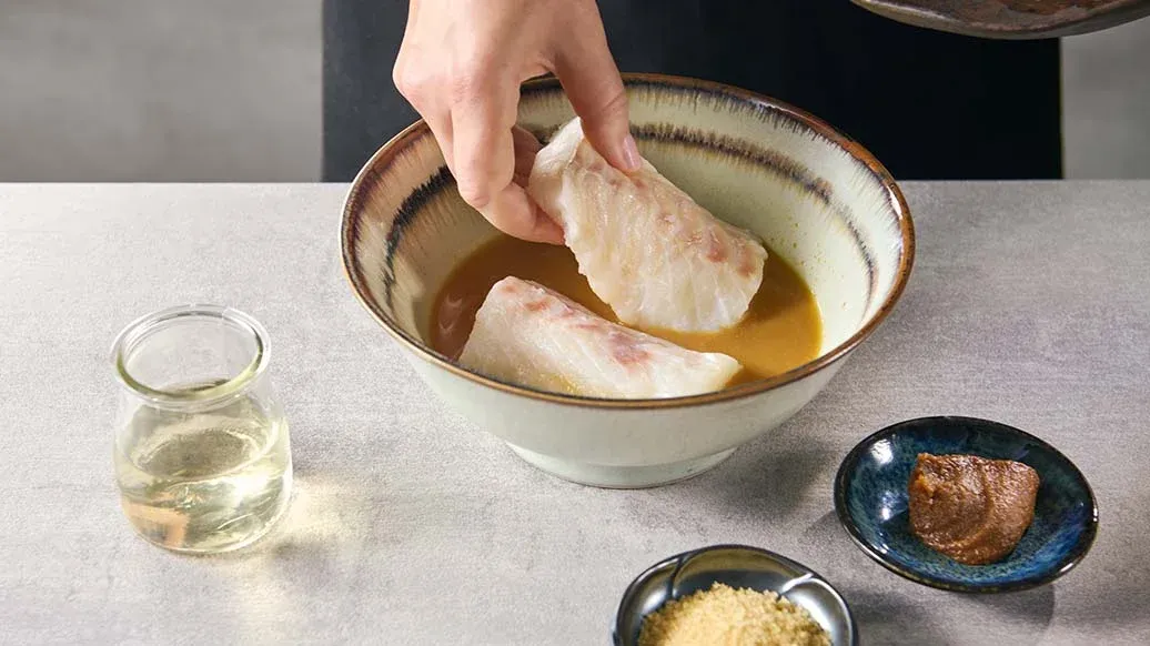 300 g torskrygg – 80 ml sake – 30 g lätt misopasta – 10 g farinsocker
