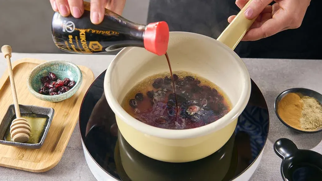 50 g tranbär – 120 ml plommonvin – 50 ml Kikkoman naturligt bryggd sojasås – 30 g honung – 1 nypa kanel – 1 nypa kardemumma