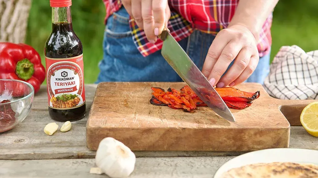 Finhacka den rostade paprikan, chipotlen och vitlöken på en skärbräda. Tillsätt olivolja och citronjuice och blanda till en pasta. Smaksätt med Kikkoman Teriyaki marinad efter smak. Bred ut en rejäl mängd av den aromatiska pepparpastan över varje tunnbröd. Strö hackad ansjovis och halverade körsbärstomater ovanpå. Ringla olivoljan över tunnbröden och garnera med de färska basilikabladen.