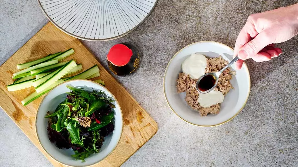 Blanda tonfisken med majonnäs och Kikkoman sojasås.