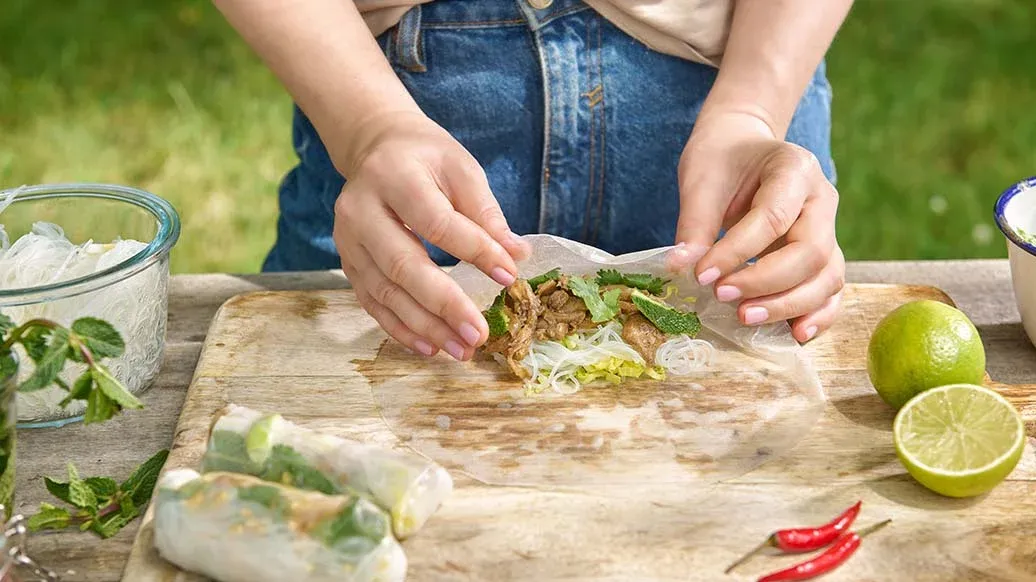 Färska och livfulla vårrullar fyllda med pulled kungsmussling, krispig sallad, doftande koriander och mynta, och knapriga nötter serveras med en pikant vietnamesisk dippsås. En fantastisk aptitretare eller uppfriskande huvudrätt.