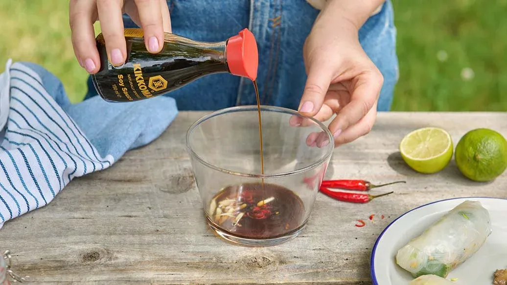 Vispa ihop Kikkoman sojasås, limejuice, socker, hackad vitlök och hackad chili i en liten skål tills sockret löst sig. Servera med vårrullarna.