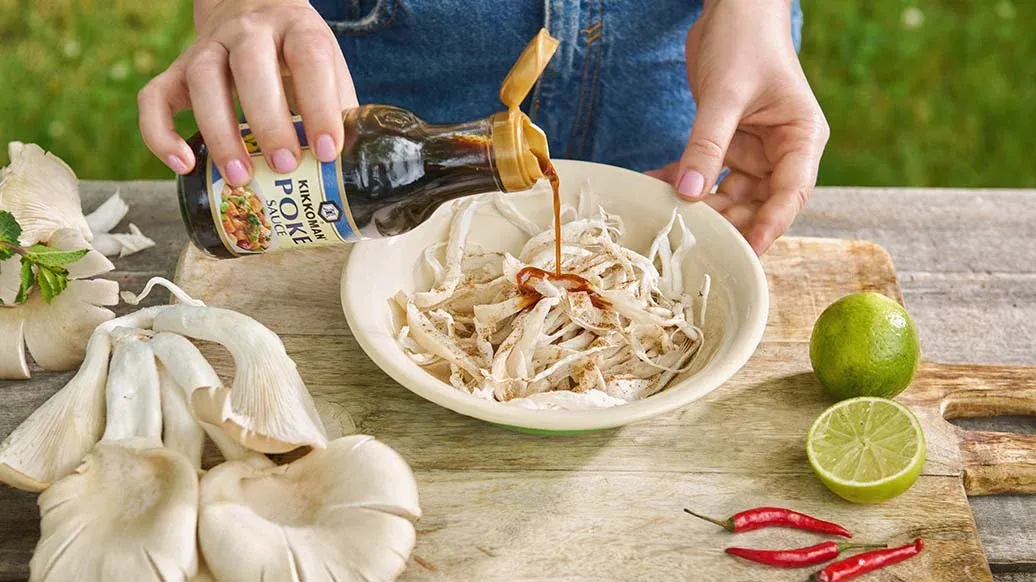 Hetta upp en panna på medelhög värme och tillsätt en skvätt olja. Fräs dina “pulled” kungsmusslingar i cirka 5-7 minuter tills de är mjuka och gyllenbruna. Tillsätt Kikkoman Poke sås och fem kryddor pulvret och koka ytterligare en minut. Låt svalna.